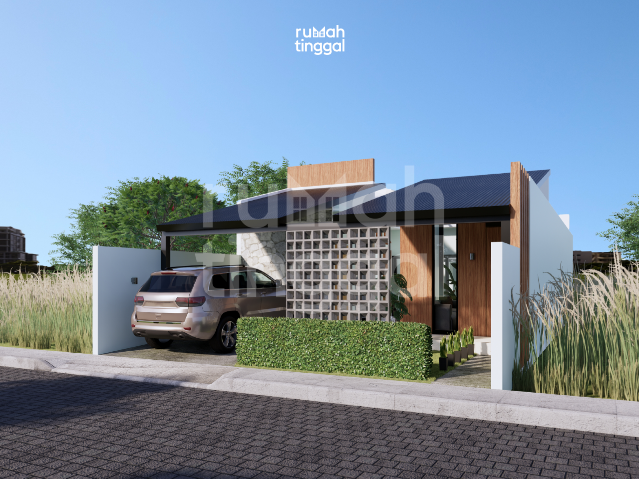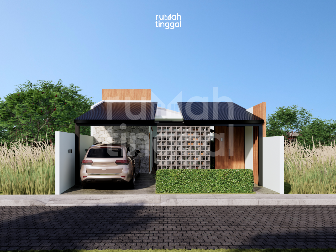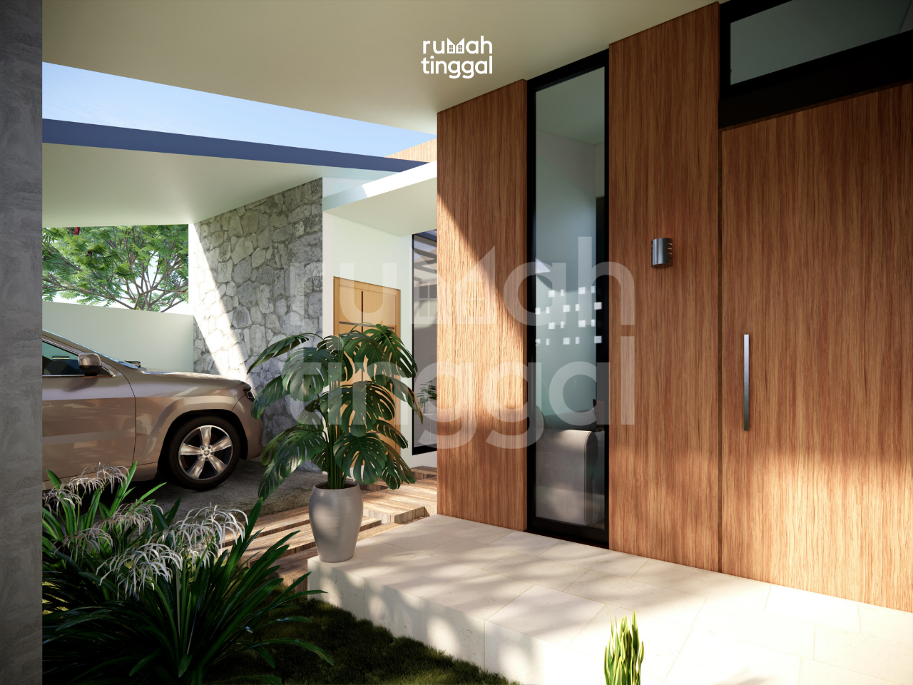 NATURE HOUSE, rumah tinggal tumbuh 1 lantai dengan luas bangunan 95.2 m2 yang didesain di atas lahan berukuran 8.00 m x 20.00 m (160 m2). Hunian ini didesain bergaya minimalis, glass house dan tropis. Area depan terdapat taman dan carport yang memuat 1 mobil. Pintu masuk utama hunian melalui pijakan kayu pada patio ke teras. Tatanan ruang pada pembangunan tahap 1 terdapat carport, 2 kamart tidur, ruang tamu, dapur dan 1 kamar mandi. Area ruang keluarga, ruang makan dan dapur didesain tanpa sekat sehingga terasa lebih luas. Pada pembangunan tahap 2 terdapat gudang, 1 kamar tidur utama dengan kamar mandi dalam, dan 1 kamar tidur anak. Terdapat pula ruang keluarga yang terhubung dengan patio pada sisi depan dan sisi belakang rumah. Hunian ini didesain dengan konsep minimalis, glass house, dan tropis. Tampak depan bangunan didominasi oleh penggunaan batu alam, material kayu untuk pintu dan dinding bagian depan ruang tamu, warna cat yang cerah dan natural serta roster. Atap dengan tritisan yang lebar dan ditambah dengan vegetasi yang asri memperkuat nuansa alami pada hunian ini.