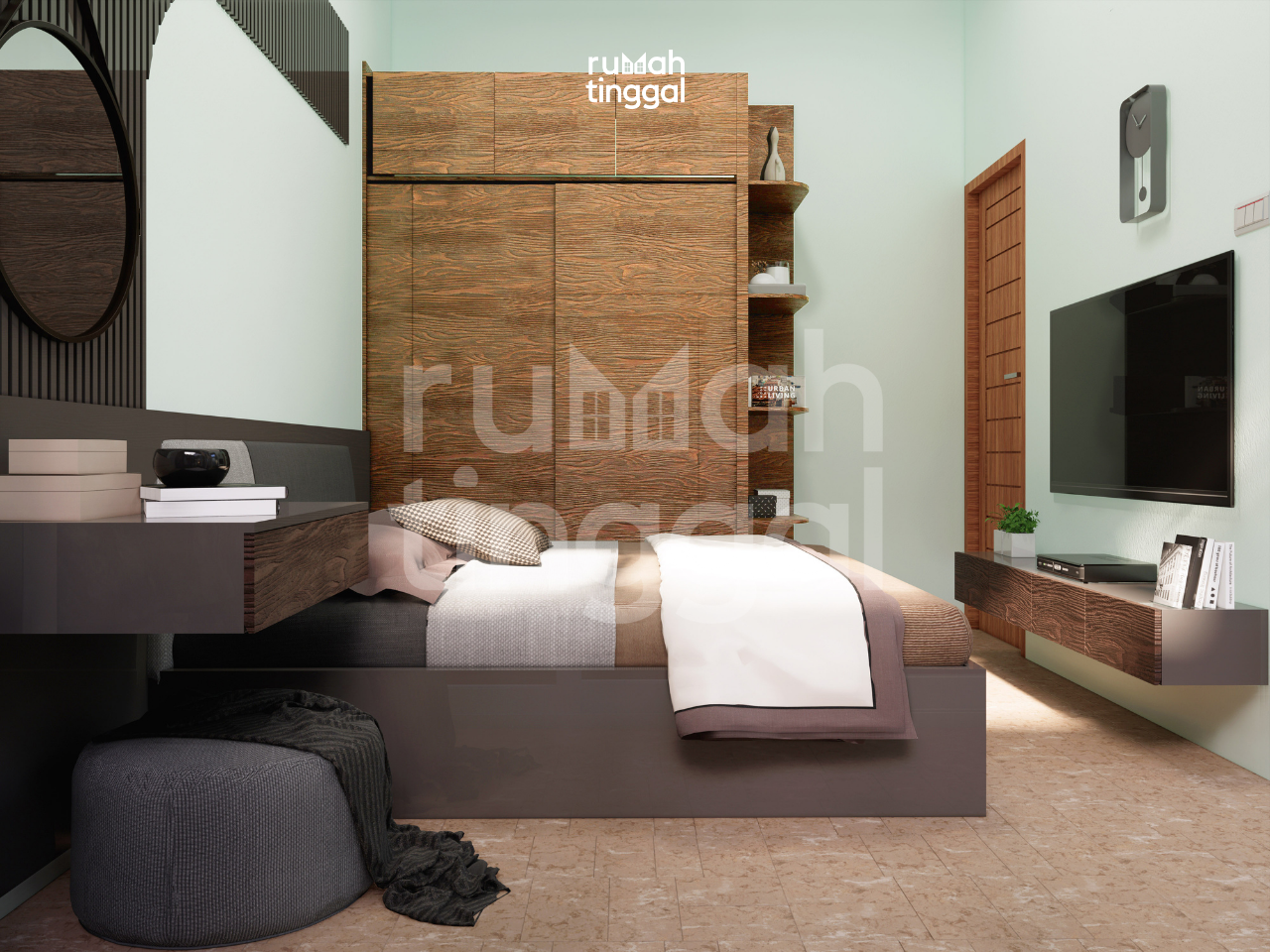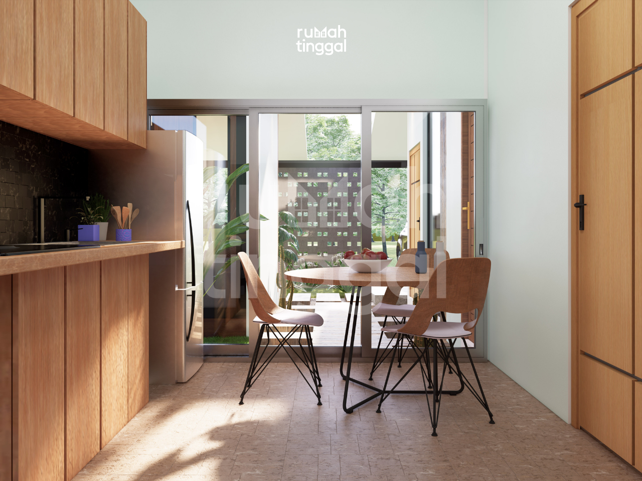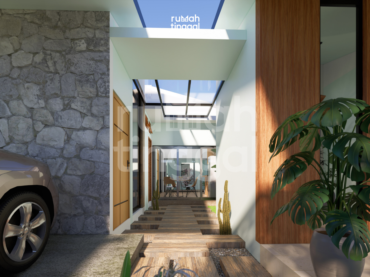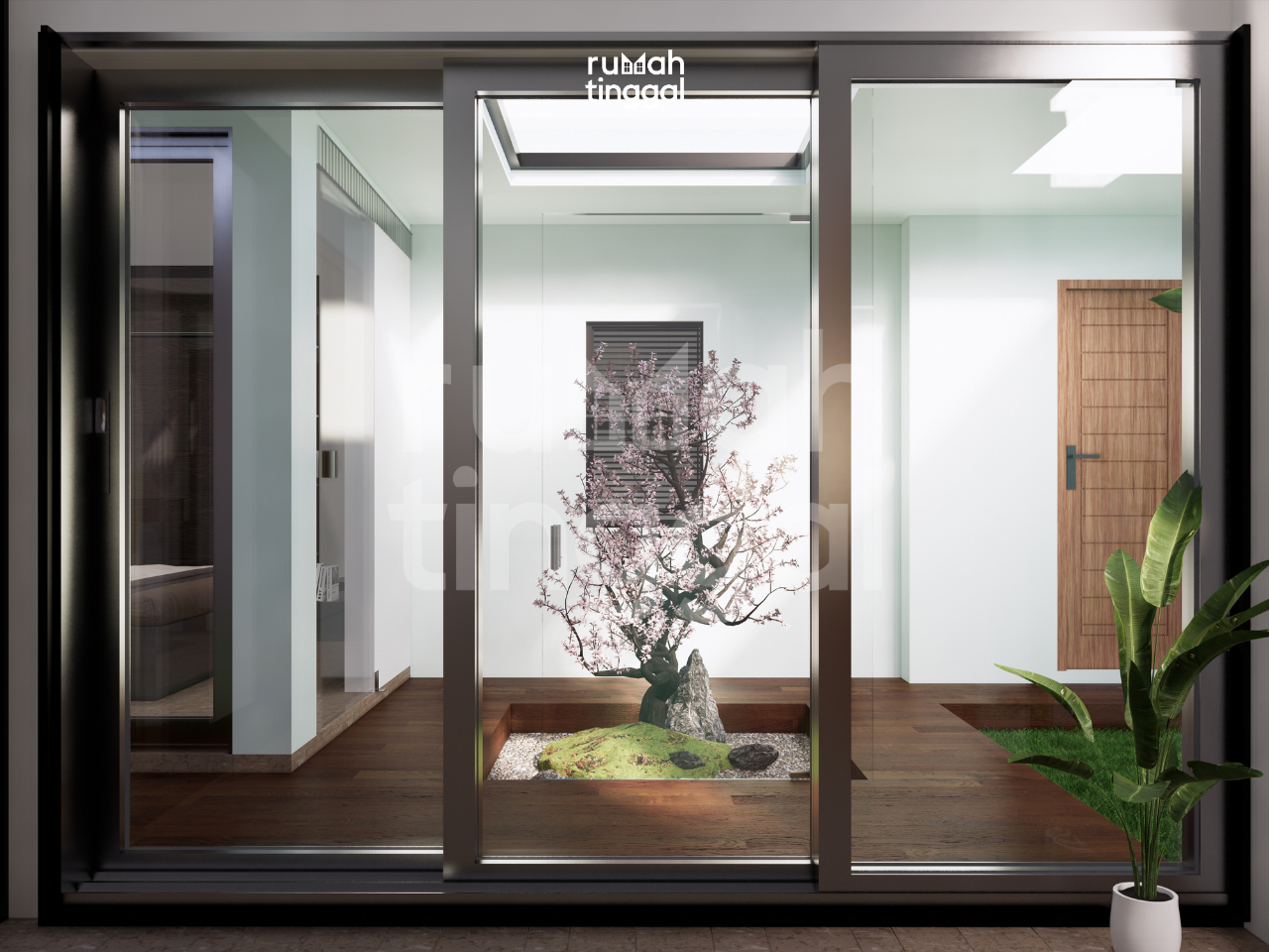 NATURE HOUSE, rumah tinggal tumbuh 1 lantai dengan luas bangunan 95.2 m2 yang didesain di atas lahan berukuran 8.00 m x 20.00 m (160 m2). Hunian ini didesain bergaya minimalis, glass house dan tropis. Area depan terdapat taman dan carport yang memuat 1 mobil. Pintu masuk utama hunian melalui pijakan kayu pada patio ke teras. Tatanan ruang pada pembangunan tahap 1 terdapat carport, 2 kamart tidur, ruang tamu, dapur dan 1 kamar mandi. Area ruang keluarga, ruang makan dan dapur didesain tanpa sekat sehingga terasa lebih luas. Pada pembangunan tahap 2 terdapat gudang, 1 kamar tidur utama dengan kamar mandi dalam, dan 1 kamar tidur anak. Terdapat pula ruang keluarga yang terhubung dengan patio pada sisi depan dan sisi belakang rumah. Hunian ini didesain dengan konsep minimalis, glass house, dan tropis. Tampak depan bangunan didominasi oleh penggunaan batu alam, material kayu untuk pintu dan dinding bagian depan ruang tamu, warna cat yang cerah dan natural serta roster. Atap dengan tritisan yang lebar dan ditambah dengan vegetasi yang asri memperkuat nuansa alami pada hunian ini.