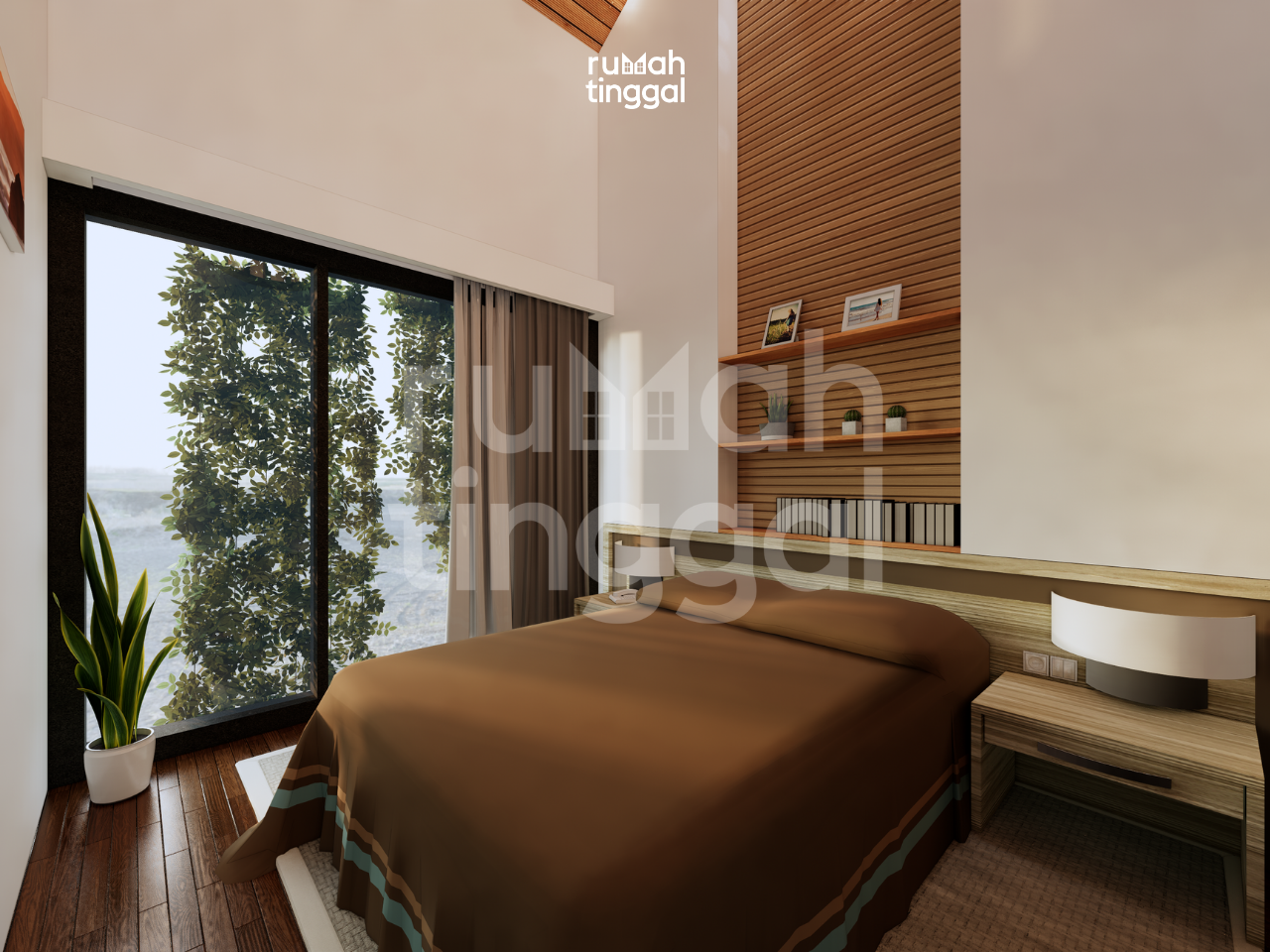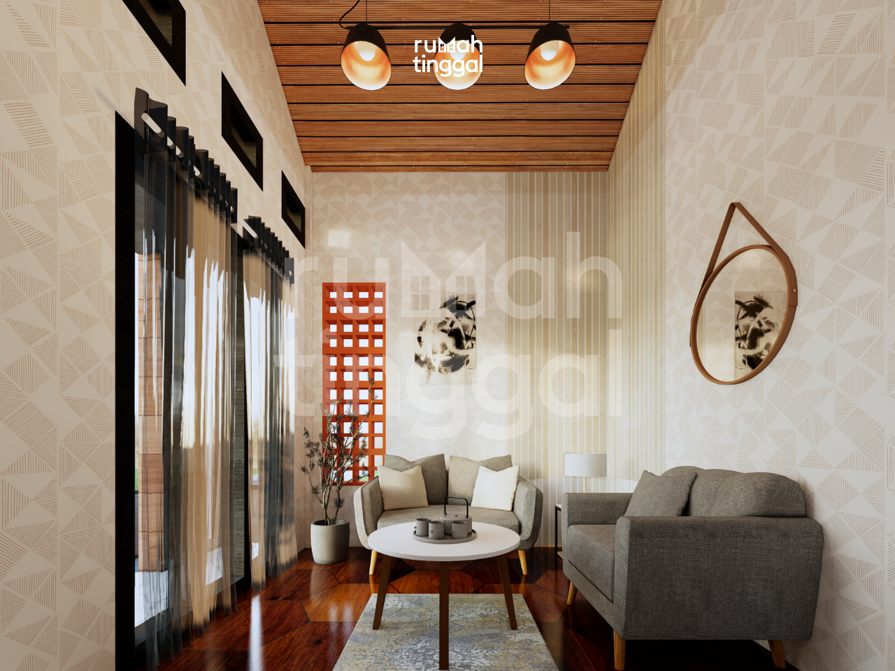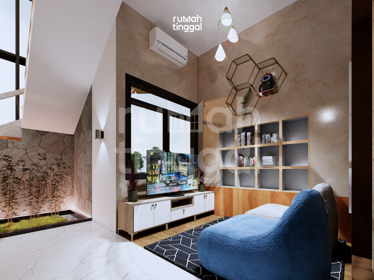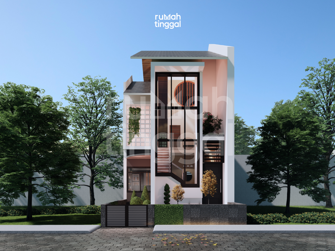 GAMA HOUSE, rumah tinggal 2 lantai dengan luas bangunan 86 m2 yang didesain di atas lahan berukuran 6.00 m x 14.00 m (84 m2). Hunian ini didesain bergaya modern, tropis, kontemporer. Pada area depan terdapat area hijau dan teras yang dipisahkan oleh jalan paving block. Pintu masuk utama hunian melalui area jalanan oleh paving block yang mempunyai elevasi 60 cm dari dasar permukaan tanah. Terdapat ruang tamu yang dikonsep agar bisa memanfaatkan luas ruang semaksimal mungkin karena ukuran lahan yang sempit. Area ruang makan dan dapur didesain tanpa sekat sehingga terasa lebih luas. Selain itu juga terdapat 1 kamar tidur, kamar mandi, serta area cuci dan jemur. Pada lantai 2 terdapat 3 kamar tidur, yaitu 1 kamar tidur utama, 1 kamar tidur anak, serta kamar tidur tamu. Terdapat pula lounge di lantai atas yang berhubung langsung dengan void, agar nuansa rumah dapat dirasa lebih lapang. Hunian ini didesain dengan konsep modern, tropis, dan kontemporer. Dikarenakan matahari sore dari sebelah kanan, maka tidak terlalu diperlukan sun shading untuk fasad bangunan, material kayu berwarna gelap untuk pintu dan jendela, serta aksen batu alam pada bagian pagar dan bagian dinding taman. Atap dengan tritisan yang 1 meter, bukaan jendela kaca yang sangat lebar dan tinggi, dan memperkuat nuansa tropis dengan membuat dekorasi tanaman pada bagian bagian jendela hunian ini.