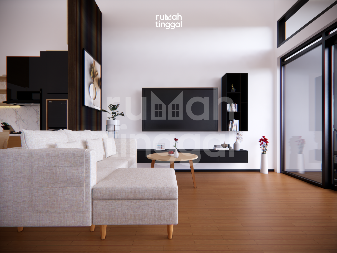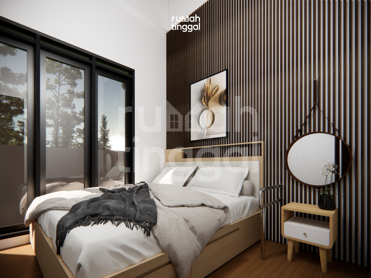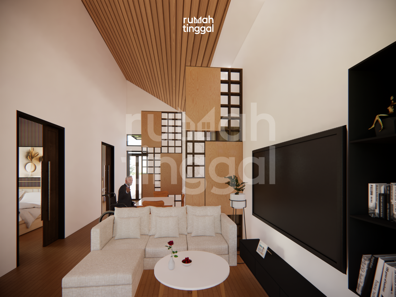 ELDERLY HOUSE, rumah tinggal 1 lantai dengan luas bangunan 72.75 m2 yang didesain di atas lahan berukuran 8.00 m x 20.00 m (160 m2). Hunian ini didesain bergaya skandanavian, modern, industrial dan tropis. Hunian ini juga didesain dengan s t a ndar keamanan dan kenyamanan aksebilitas dalam memenuhi kebutuhan dan aktivitas lansia pengguna kursi roda. Area depan terdapat taman dan carport yang memuat 1 mobil . Pintu masuk utama hunian melalui trap tangga ke area teras. Pada area teras terdapat ramp dengan railing yang digunakan sebagai jalur sirkulasi untuk pengguna kursi roda Tatanan ruang pada lantai 1 Area ruang keluarga, ruang makan dan dapur didesain tanpa sekat sehingga terasa lebih luas. Selain itu juga terdapat 3 kamar tidur, kamar mandi dan mushalla serta area cuci dan jemur. Pada bagian belakang terdapat kamar mandi luar, area 3 cuci jemur dan. taman. Hunian ini didesain dengan konsep skandanavian, modern, dan industrial. Tema warna bangunan terdiri atas warna hitam, abu-abu, putih dan coklat yang memberikan kesan modern dan tegas dan hangat. Tampak depan bangunan didominasi oleh penggunaan baja dengan finishing warna hitam, material kayu untuk pintu, jendela, dan plafond. warna cat yang cerah , dan plesteran ekspose pada dinding luar. Penggunaan metal expanded pada fasad berfungsi untuk melindungi tampiasan air hujan serta filtrasi cahaya. Bukaan jendela kaca yang lebar dan tinggi, kombinasi baja, kayu dan beton ekspose ditambah dengan vegetasi yang asri memperkuat nuansa, modern, industrial dan tropis pada hunian ini.
