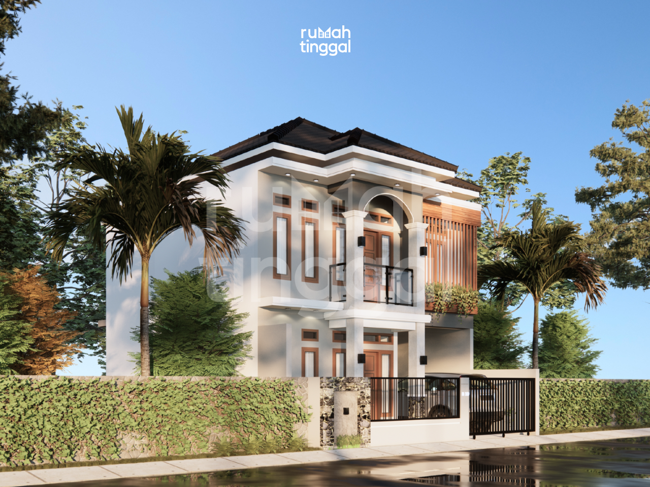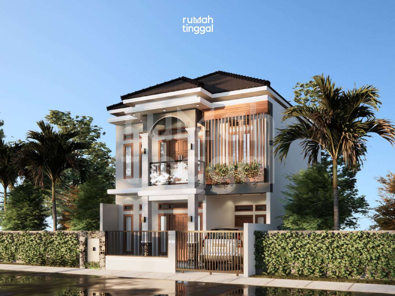 SHINTA’S HOUSE, rumah tinggal 2 lantai dengan luas bangunan 111,5 m2 yang didesain di atas lahan berukuran 92 m2 dengan lebar lahan 7 m. Hunian ini didesain bergaya modern, minimalis, tropis. Area depan terdapat taman dan carport yang dapat menampung 1 mobil atau 4 motor. Pintu masuk utama berada di tengah hunian. Tatanan ruang pada lantai 1 terdapat ruang tamu, area bawah tangga yang dapat difungsikan sebagai kabinet, kamar tidur, toilet, dan dapur. Area belakang hunian terdapat teras dan taman belakang yang memiliki view danau. Di lantai 2, terdapat dua kamar tidur dengan 1 kamar mandi luar, musholla, serta ruang keluarga yang memiliki balkon di depan dan belakang hunian. Hunian ini didesain dengan konsep modern, minimalis, dan tropis. Tampak depan bangunan didominasi oleh penggunaan warna dinding abu-abu, material batu alam berwarna senada, dan bak tanaman berwarna coklat dengan kisi-kisi kayu yang berfungsi untuk mengurangi intensitas angin yang masuk ke dalam hunian. Bak tanaman juga diberikan pada balkon belakang rumah. Pagar yang sebagian besar menggunakan kisi kisi terbuka berfungsi untuk menghormati para tetangga yang tidak menggunakan pagar pada huniannya. Penggunaan atap berbentuk limasan menyesuaikan dengan bentuk atap rumah sekitar hunian.