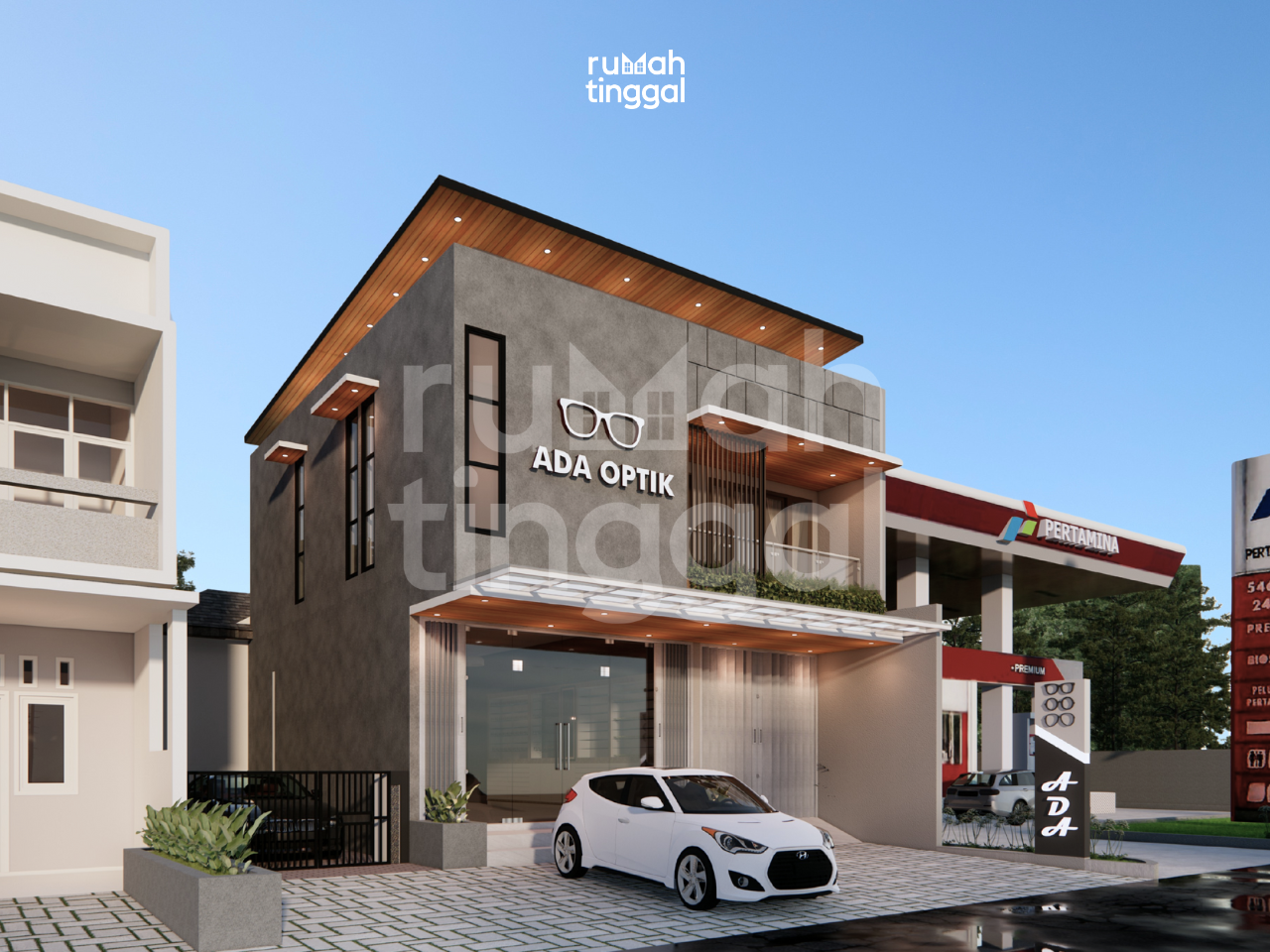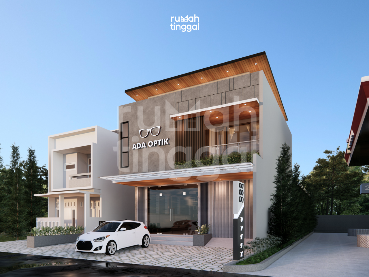 OPTIK HOUSE, rumah tinggal dan toko optik yang memiliki 2 lantai dengan luas bangunan 161,8m2 yang didesain di atas lahan berukuran 11.90 m x 8.42 m (100m2). Hunian ini didesain bergaya modern, tropis, Minimalis. Area depan terdapat carport untuk penghuni rumah dan juga untuk pengunjung toko optik. Carport tersebut cukup muat 3 mobil dan 5 motor. Pintu masuk utama hunian melalui foldingdoor bagian sebelah kanan. Tatanan ruang pada lantai 1 di bagi menjadi 2 zona. Zona sebelah kanan sebagai garasi mobil, area masuk hunian ruang potong lensa dan juga toilet bagi karyawan serta zona sebelah kiri sebagai toko optik, dimana ada untuk tes mata kasir dan juga display kacamata. Pada lantai 2 terdapat 2 kamar tidur , dengan 1 kamar mandi luar. Ruang tamu terdapat dekat dengan tangga di lantai 2. Terdapat pula ruang keluarga atau ruang santai yang terhubung dengan dapur serta ruang makan. Hunian ini didesain dengan konsep modern, tropis, dan Minimalis. T ampak depan bangunan didominasi oleh penggunaan beton ekspose dengan finishing cat kamprot. Adanya kisi-kisi dari kayu ataupun bisa menggunakan WPC pada area balkon, material alluminium untuk pintu dan jendela, warna cat yang monokrom, serta aksen tali air. Atap dengan tritisan yang lebar, bukaan jendela kaca yang tinggi, ditambah dengan vegetasi yang asri memperkuat nuansa tropis pada hunian ini.