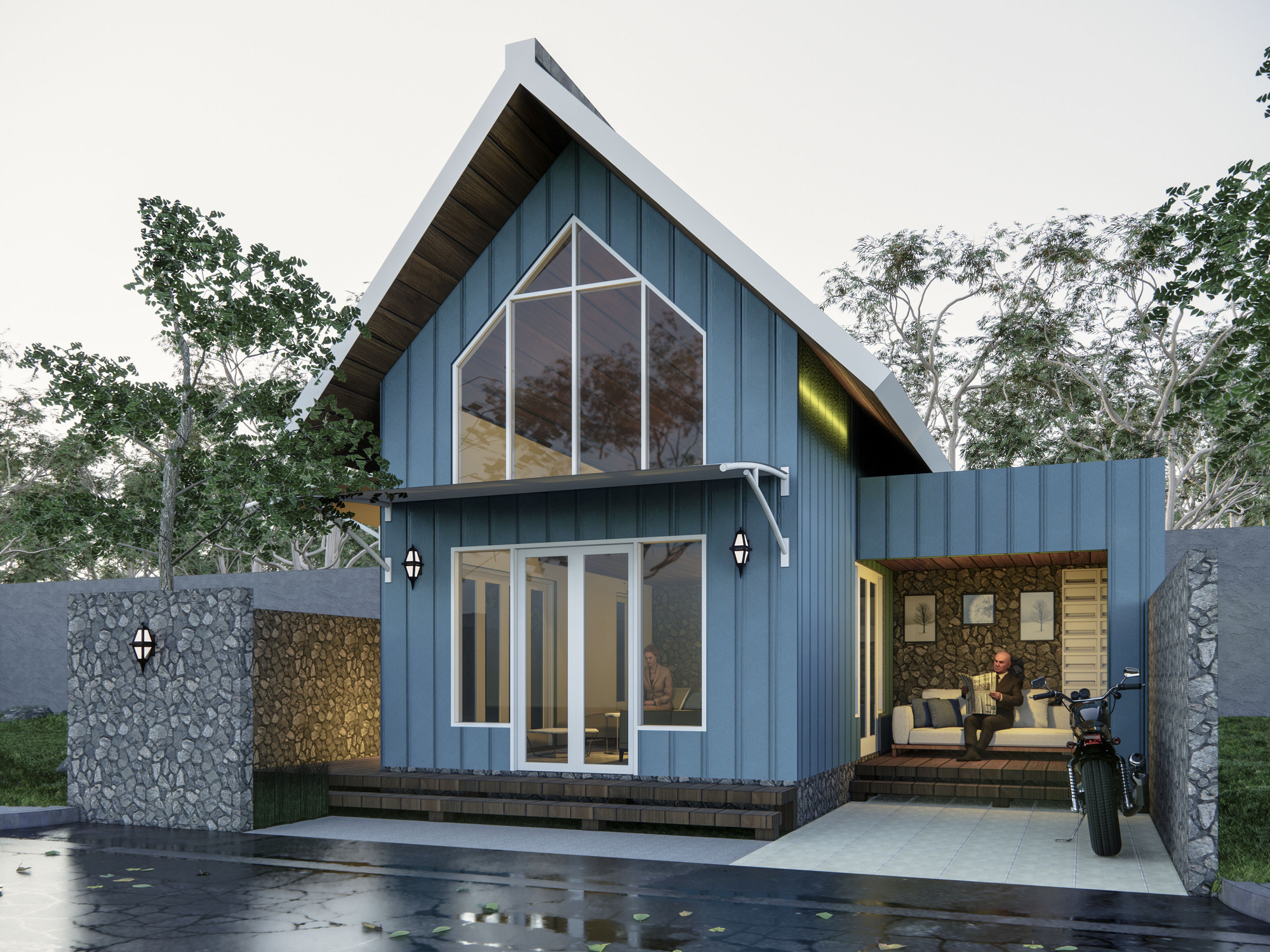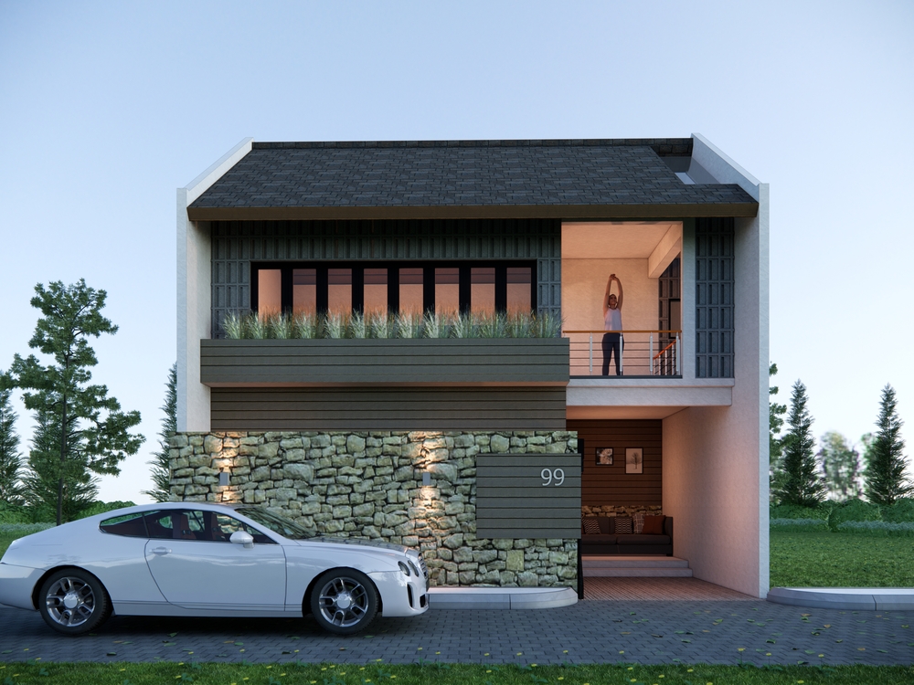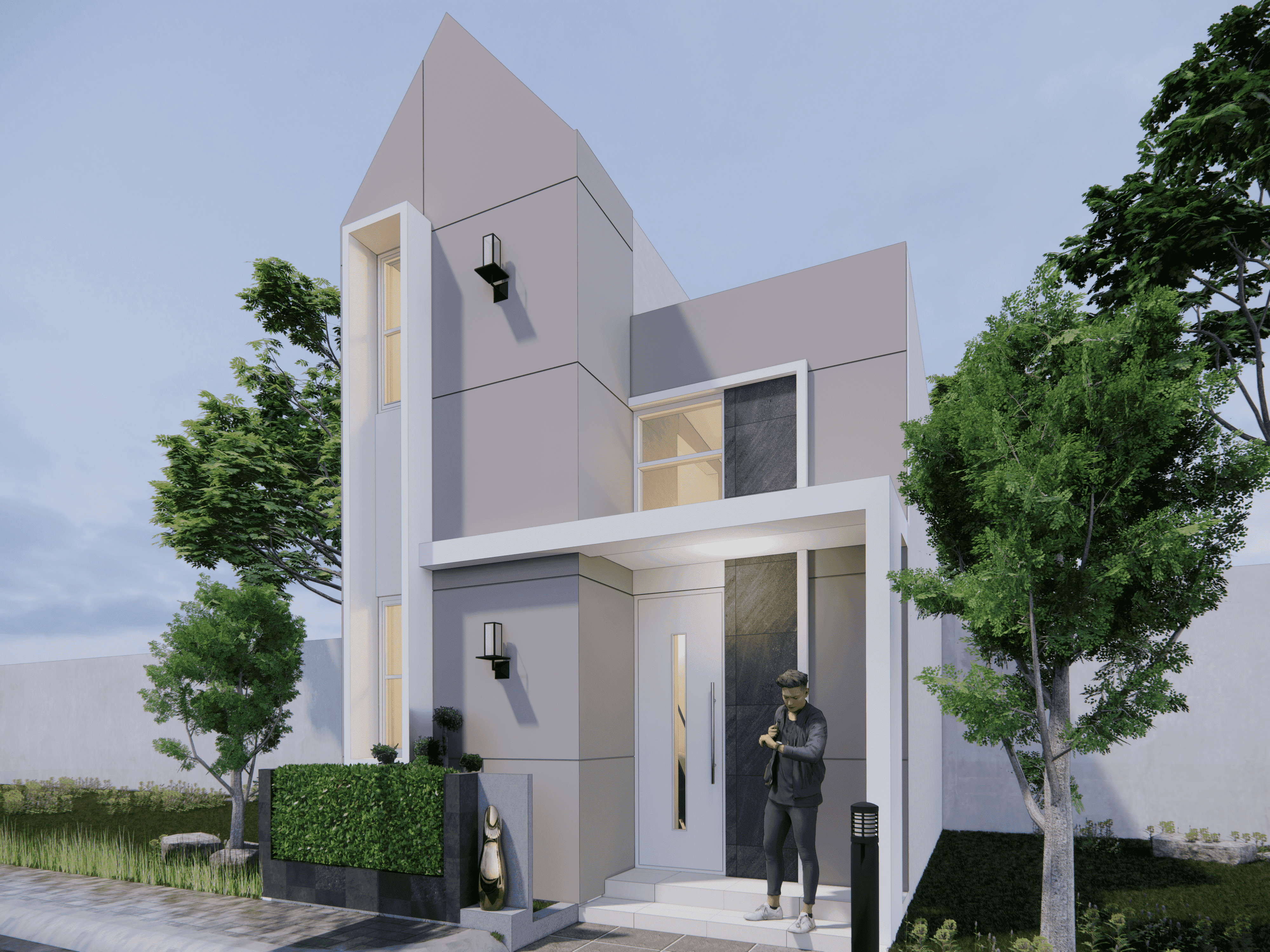 Luxury Scandinavian House merupakan rumah tinggal 3 lantai bergaya scandinavian dengan luas total bangunan 316 m2 yang didesain di atas lahan berukuran 10 m x 25 m (250 m2). Rumah ini didesain fungsional, nyaman, dan elegan. Pada area depan rumah terdapat carport dengan kapasitas 1 mobil, taman, dan teras. Terdapat 2 akses pintu masuk, yaitu pintu masuk utama melalui tangga depan dan pintu masuk area servis melalui garasi di lantai semi basement. Hunian ini memiliki semi basement yang difungsikan sebagai garasi dengan kapasitas 1 mobil, mushala beserta tempat wudhu, serta area servis seperti kamar tidur ART, toilet ART, dapur kotor, dan ruang laundry. Memasuki lantai 1 melalui tangga depan akan disambut oleh ruang tamu. Ruang tamu, ruang makan, dapur bersih beserta kitchen island dirancang open layout tanpa sekat dinding pemisah agar ruang terasa lega. Ruang makan terhubung ke teras belakang dan kolam renang sebagai view dari dalam rumah. Selain itu juga terdapat kamar tidur tamu yang dilengkapi dengan toilet dalam. Menuju ke lantai 2 dikhususkan sebagai area privat. Terdapat ruang kamar tidur utama yang dilengkapi dengan walk in closet dan toilet. Kamar tidur utama ini memiliki akses privat ke balkon. Pada lantai 2 juga terdapat 2 kamar tidur anak yang masing-masing sudah dilengkapi dengan toilet dalam. Luxury Scandinavian House dirancang dengan konsep scandinavian, modern, dan tropis. Eksterior bangunannya didesain simple dengan bentuk atap segitiga yang merepresentasikan ciri khas bangunan scandinavian. Dinding pada bagian depan rumah didominasi cat warna putih dengan variasi cat tekstur warna beige, serta aksen woodplank pada salah satu sisi bangunan untuk memberikan kesan natural. Pada hunian ini. terdapat bukaan pintu jendela yang lebar untuk mengoptimalkan pencahayaan dan penghawaan alami di dalam bangunan. Adanya vegetasi di area taman juga menjadikan hunian ini nampak semakin asri.